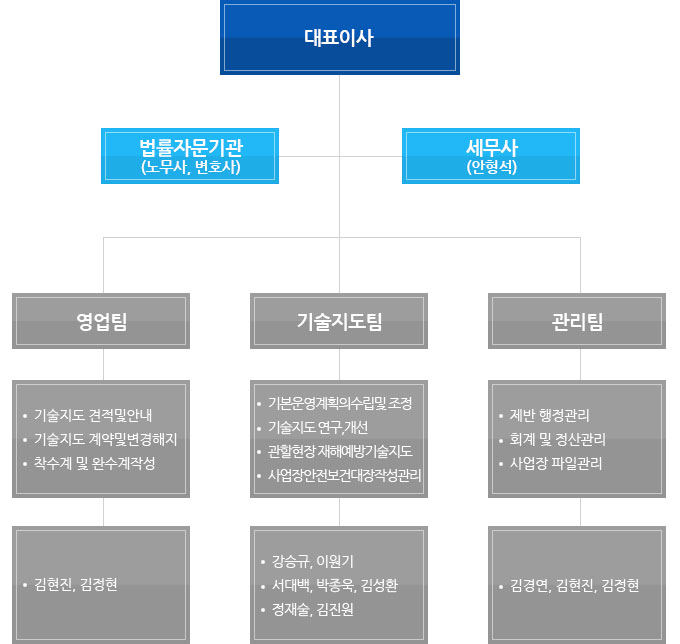 | 영업팀 | 1. 기술지도 견적 및 안내 2. 기술지도계약 및 변경해지(서울,경기,인천,강원,충청) 3. 기술지도 착수계 및 완수계 작성 |